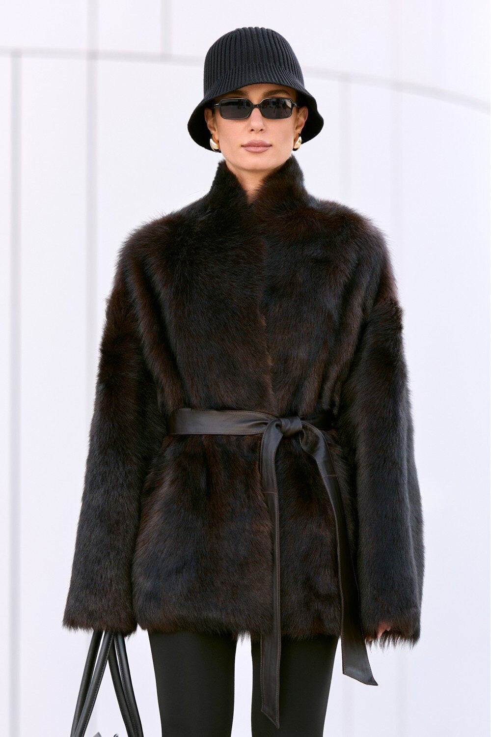 This shearling coat with belt embodies the art of modern minimalism. Made from natural, velvet-soft shearling in a rich espresso tone, it elegantly drapes the figure, conveying refined confidence. The soft texture contrasts with the smooth leather belt, defining the silhouette in a feminine, sculptural line.