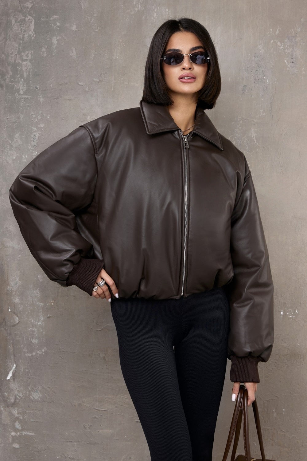 Genuine brown leather jacket featuring a classic silhouette, rich texture, and timeless appeal for versatile styling.