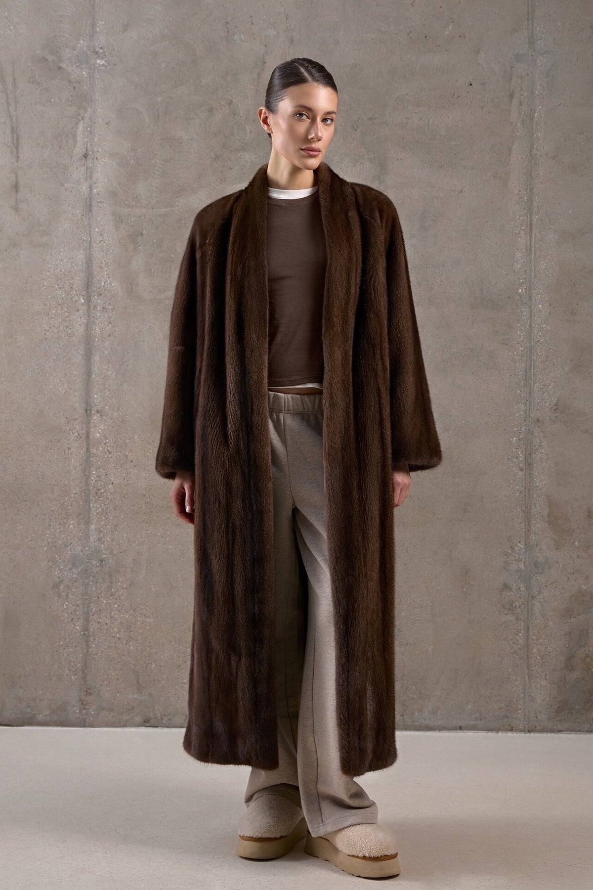 Avvolgiti nell'opulenza con questo lungo cappotto in visone autentico, una vera espressione di lusso senza tempo. Realizzato con maestria dalla migliore pelliccia di visone autentica, la sua ricca tonalità esalta la lucentezza naturale e la morbidezza impareggiabile del cappotto. La silhouette a tutta lunghezza cade con grazia, offrendo sia un calore eccezionale che un'eleganza raffinata.