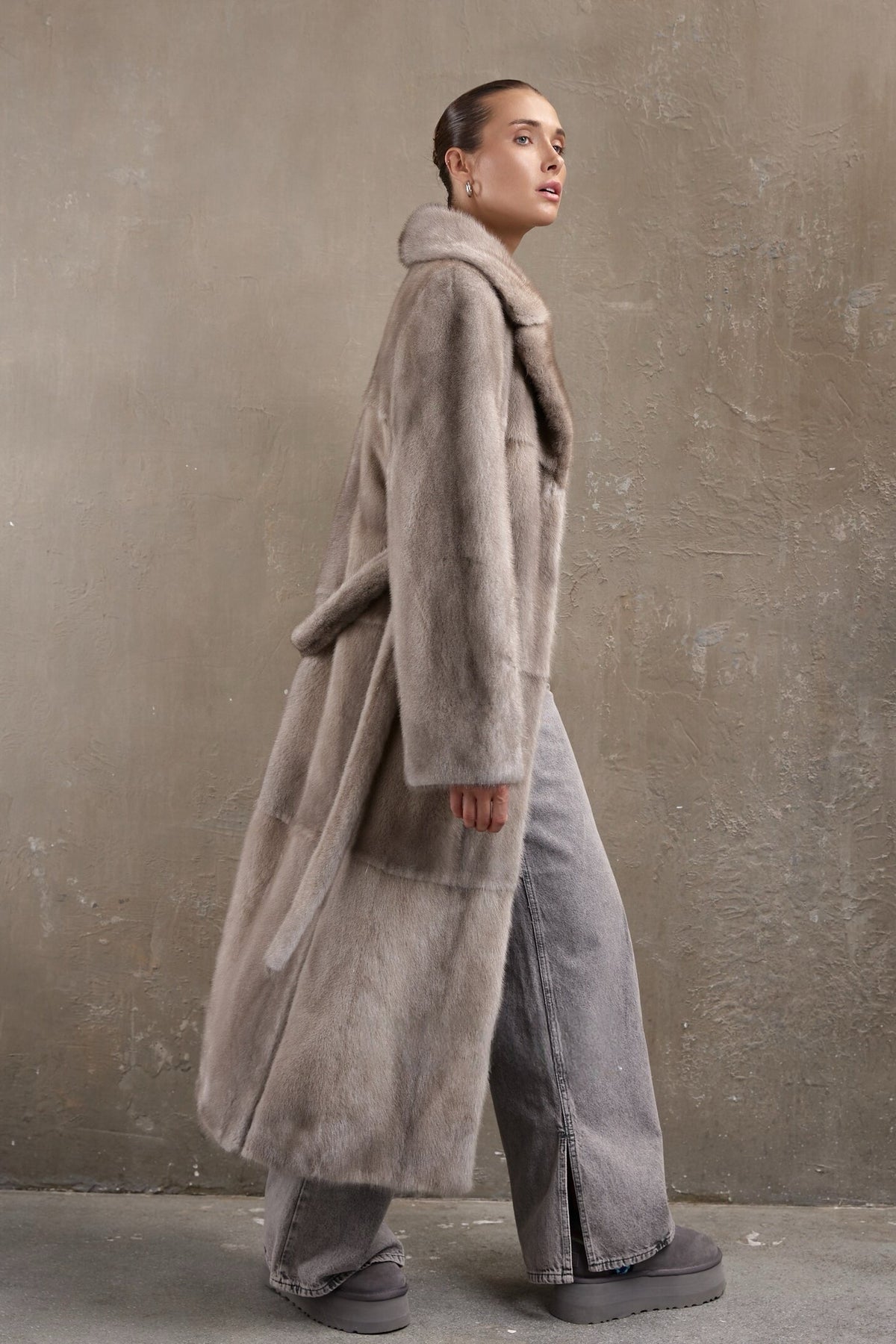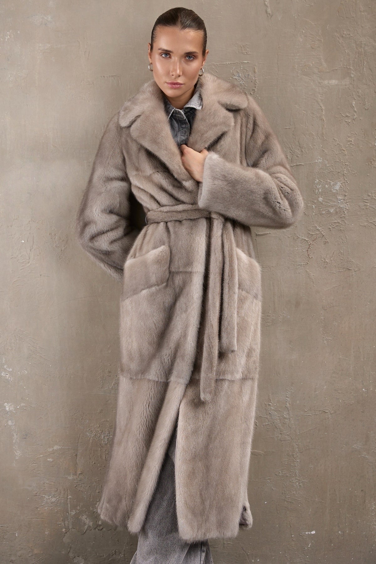 Wrap yourself in opulence with this long grey Mink Coat, a true expression of timeless luxury. Expertly crafted from the finest genuine mink fur, its soft hue enhances the coat’s natural luster and unmatched softness. The full-length silhouette drapes gracefully, offering both exceptional warmth and refined elegance.